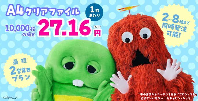 オリジナルデザインで作成可能なクリアファイル印刷は、販促グッズやノベルティに最適です。A4・A5他様々なサイズにて、小ロット~大ロットまで対応可能。全面印刷でデザインの自由度が高く、高品質・高発色を低価格で実現します。箔押し名入れ・紙製・エコ素材のクリアファイル印刷もおすすめです。