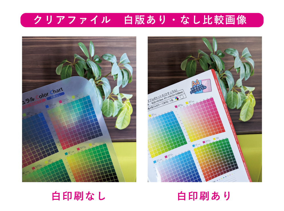クリアファイルの素材は透明なので、白インキを使って白い背景を印刷しないと、