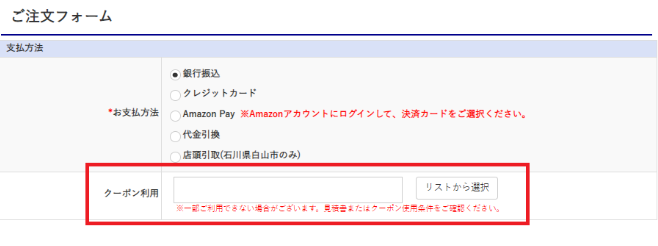 お持ちのクーポンを適用したい場合は、ご注文に進んでいただき支払方法選択画面よりクーポンコードご入力いただく必要がございます!