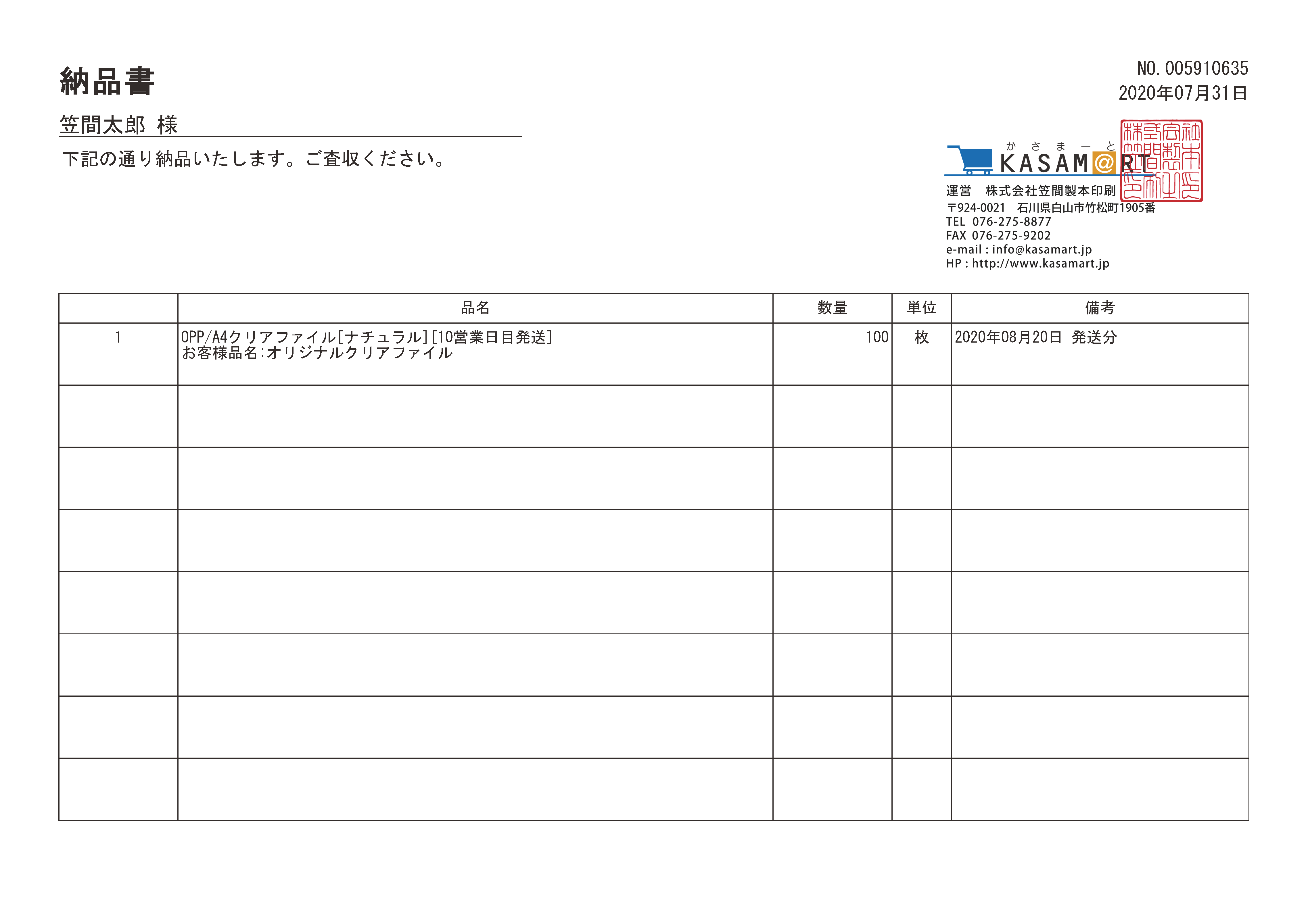 ・納品書は商品発送ごとの出力となります。また、書類の性質上金額は記載しておりません。