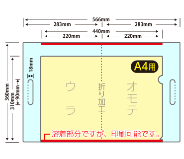 セミナー、展示会、オープンキャンパス、イベントに最適な、実用的でPR効果が高い販促ツールです。角2封筒がすっぽり入るので資料の持ち帰りに便利なサイズ。持ち帰った後は取っ手部分のミシン目を切り取ることで、A4クリアファイルとしてご使用いただけます。