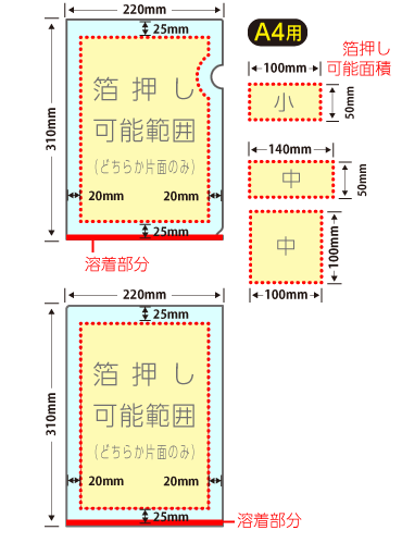 箔押面積 | 小サイズ(100mm×50mm) 中サイズ(100mm×100mm、140mm×50㎜) (ベタ領域:最大25㎜×25㎜) |