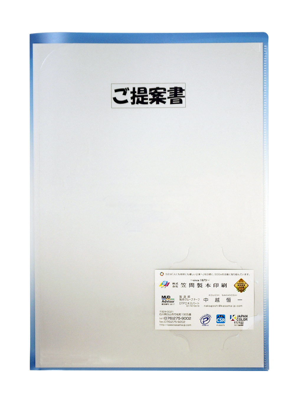 オリジナルデザインで作成したクリアファイルに名刺ポケット、名刺スリットをおつけすることが可能です。書類と一緒に名刺を添えて渡したり、資料整理の際も便利です。