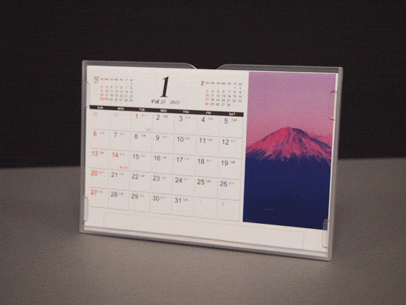 お気に入りの写真や別の月のカレンダーを挟み込める、便利なクリップがケースに付いています。縦置き、横置きが選べます。選んだデザインのカレンダー下部に名入れ印刷、表紙のみオリジナルデザイン、全ページオリジナルデザインからご希望に応じてお選びいただけます。