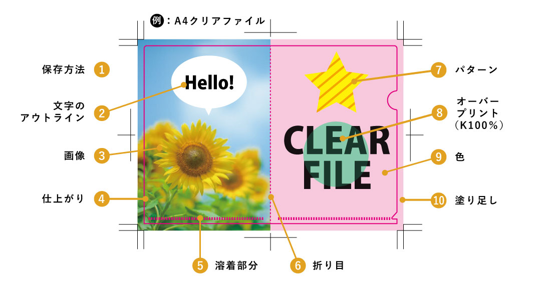 5 溶着部分 | 溶着部分にも印刷は可能ですが、切れてはいけないデザインや読ませたい文字は、仕上がり線から7mm以上内側に配置してください。 |