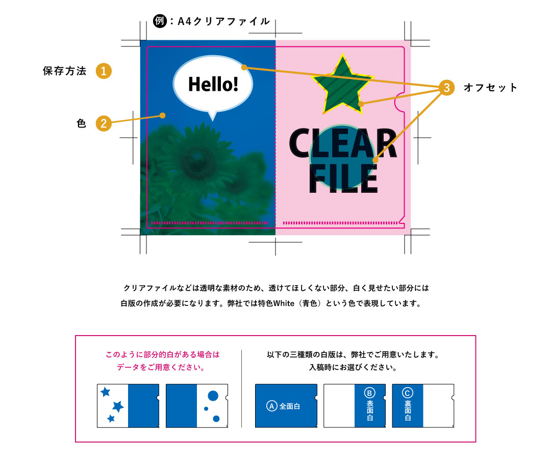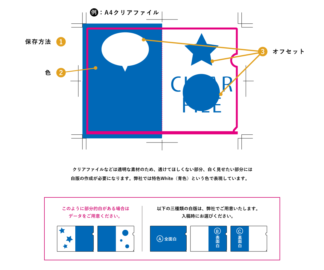 1 保存方法 | テンプレートの「White」にレイヤー白版データを作成し、透明効果「乗算」処理をしてから保存してください。 |