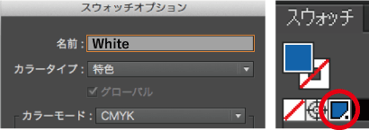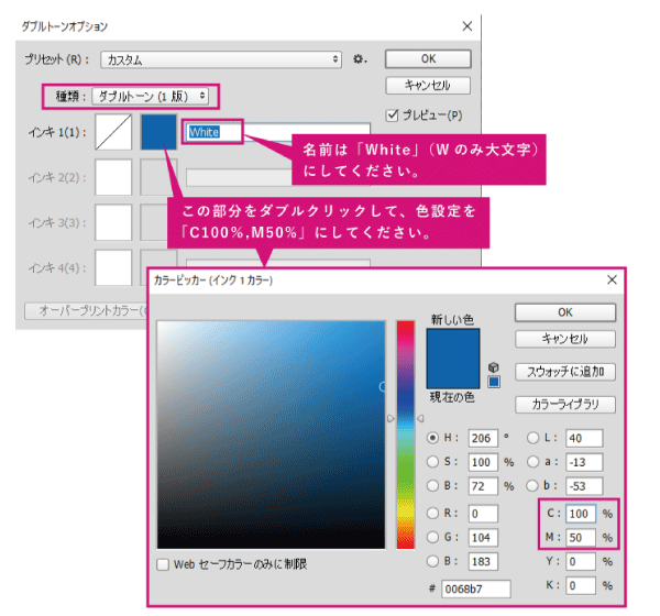 白2回印刷の場合は、2回目用の白版データには特色White3(C100%、Y50%)を適用してください。
