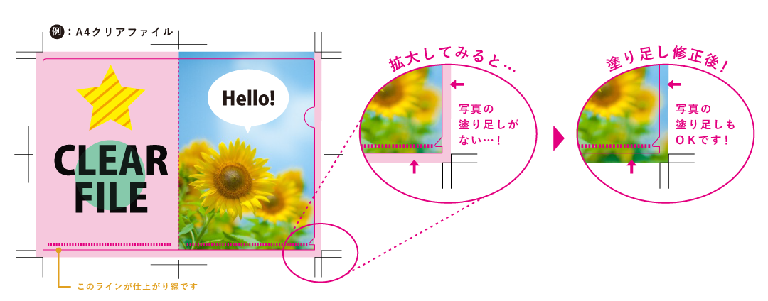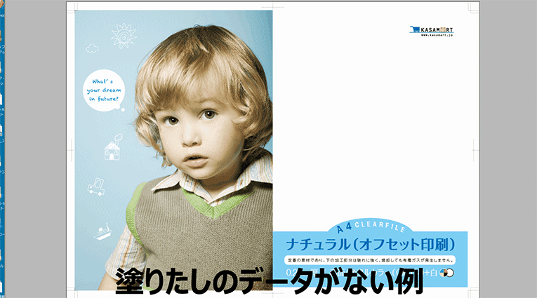 仕上がり線に対して塗り足しを3mm付けてデータ作成いただくことをおすすめしていますが、見落としがちなのが、背景は塗り足しが足りているのに、その上層にあるデザインの塗り足しがない場合です。このままでも印刷は可能ですが、クリアファイルの形に型抜きする際に、デザインが途切れてしまうことがあります。ご入稿前にぜひチェックしてみてください。