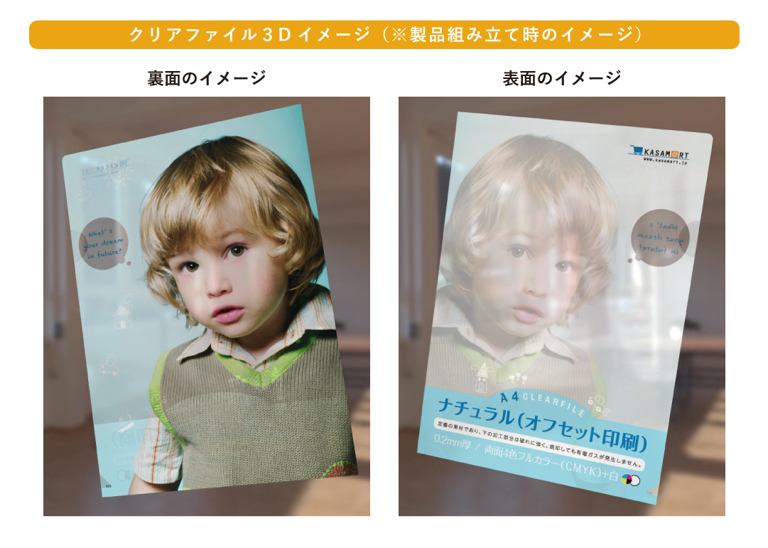 白い紙にカラー版データを印刷すると、白は紙の白色で表現されますが、クリアファイルは透明な素材に印刷するため、白色を表現するには、白インキの印刷が必要となります。