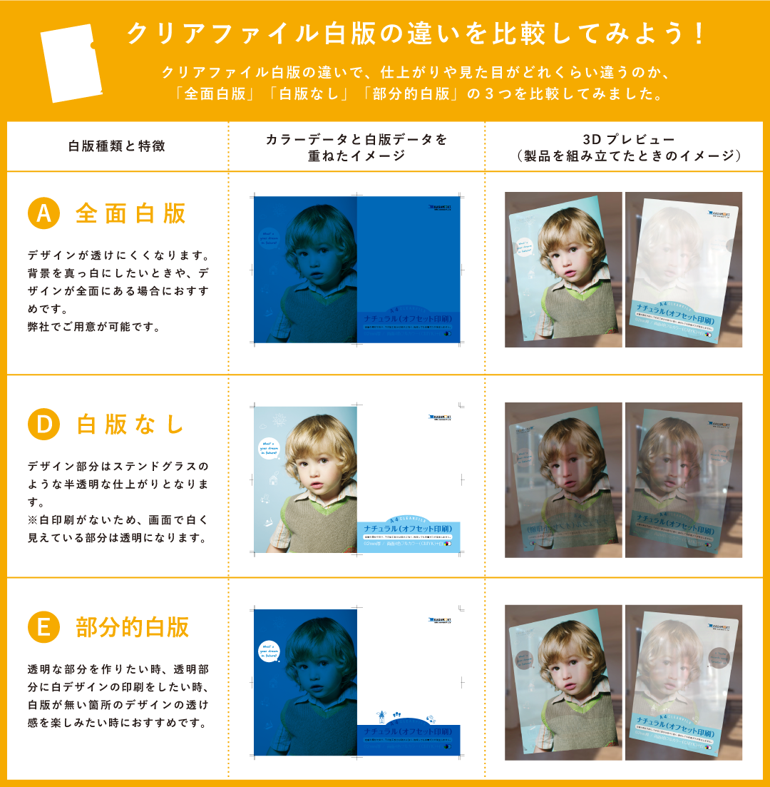 ![]() ※「E:部分的白版」の白版データは、お客様に作成いただいております。 白版データのご入稿がない場合は、メールにてデータのご入稿をお願いする旨のご連絡をさせていただきます。 ※表裏どちらかが片面白版&もう片面が部分的白版の場合や、白版濃度を下げて印刷されたい場合は、「E:部分的白版」となります。 |