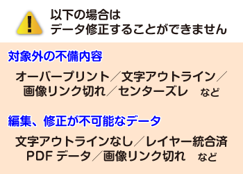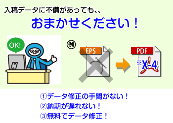 対象内のデータ不備があった場合、当社で手直しすることによって、お客様に再入稿頂くことなくスムーズに印刷へ進めます!